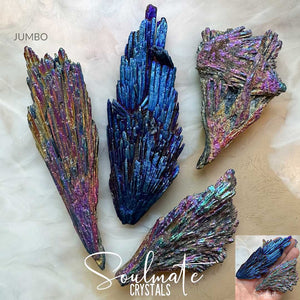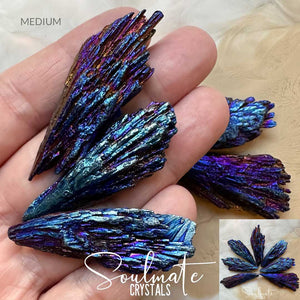 This collection of Brazilian Black Kyanite Titanium Aura crystals features a mix of natural elongated and wider fan shapes. The pieces have varying amounts of Titanium Aura bonding with a light to medium coating. The colours include combinations of mid to bright cobalt blue, gold and fuchsia, all of which dazzle in the sunshine. If you have a shape preference, please leave a note during checkout. Choose your preferred crystal size via the options menu below.