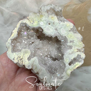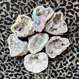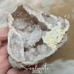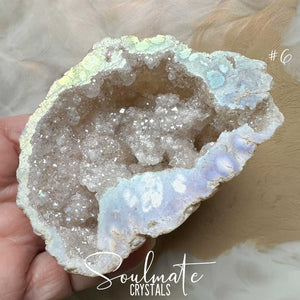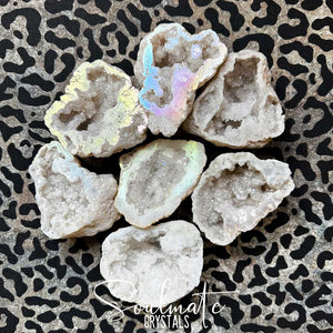 You will receive one Angel Aura Quartz Raw Natural Crystal Geode Half XL from the lot pictured size approximately 75-85mm, 146-166g.These natural Moroccan geodes are halved to showcase the raw, sparkly inner druze crystals which are then coated via the aforementioned Angel Aura bonding process. Each half crystal geode looks like a little cloud with shimmery irridescent reflects and no two are alike. These charming half geodes elevate any sacred space, crystal garden or as part of a decorative display around the home. Each piece is individually photographed to give you a detailed view with one flash of Angel Aura which will change when the item is rotated. Choose your preferred geode via the options menu below.